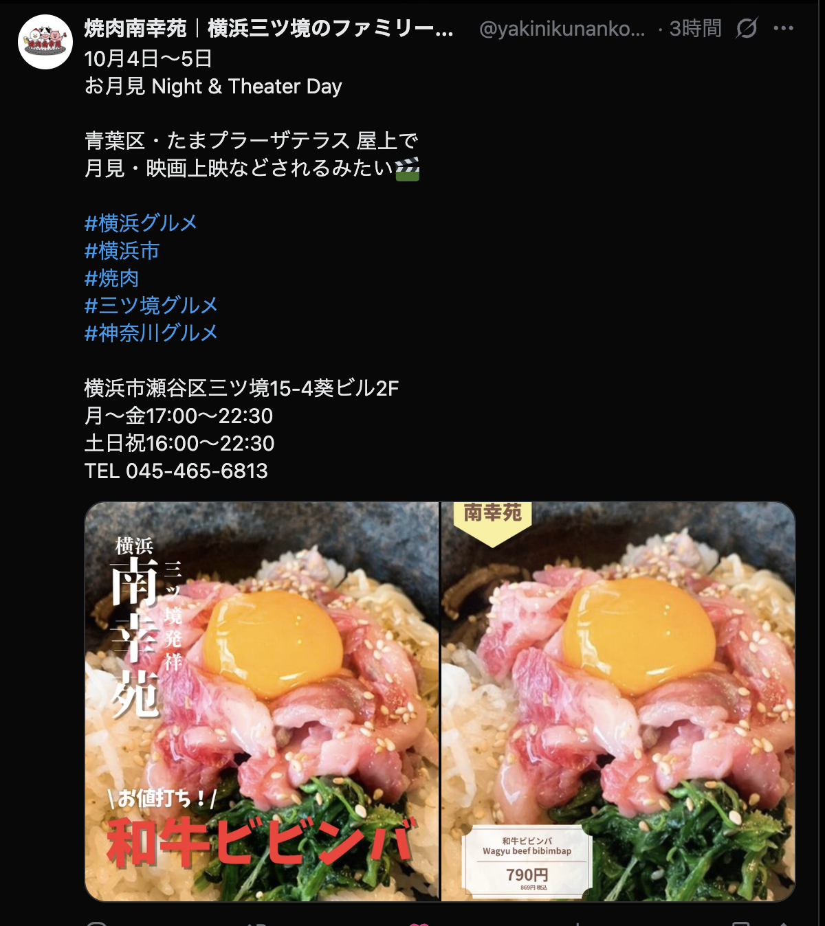 「三ツ境のしあわせ食堂」焼肉南幸苑は、公式X(旧Twitter)で毎日元気に更新中! 開設から10ヶ月、お得な情報やお店の雰囲気、スタッフの想いなどを日々お届けしています。 これからも皆さまに楽しんでいただける発信を続けてまいりますので、ぜひフォローしてチェックしてください。 焼肉南幸苑のXはこちらから